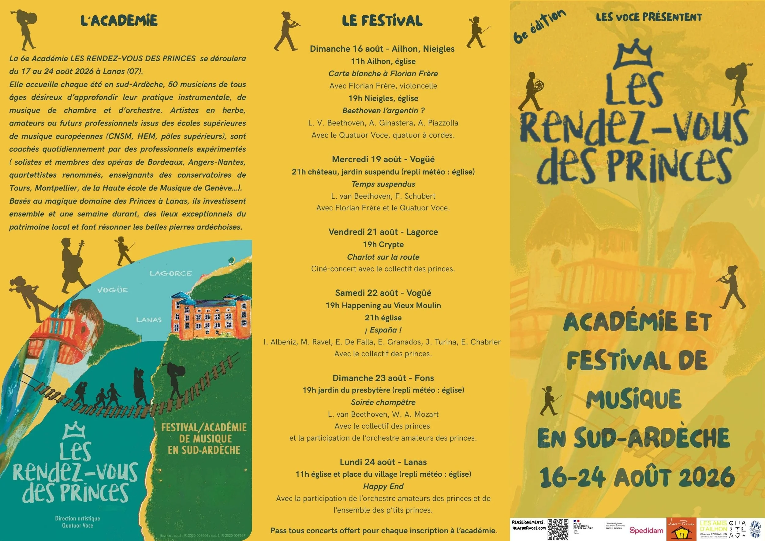 Cet été aux 6e Rendez-vous des princes, on pratique la musique à tous âges et à tous niveaux dans un cadre enchanteur et coachés quotidiennement par des musiciens de haut vol. Artistes en herbes, amateurs ou étudiants d’écoles supérieures, l’Ardèche vous attend !